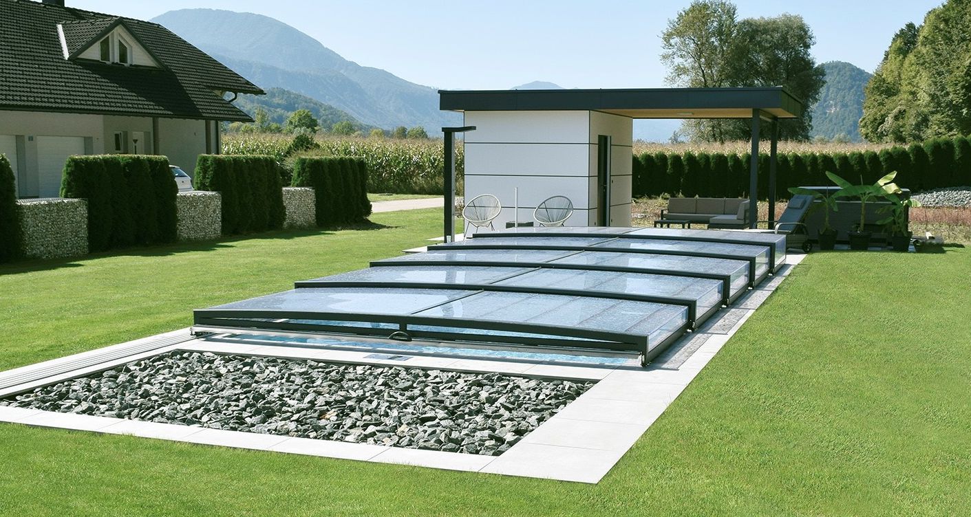 Een zwembadoverkapping of zwembadafdekking van Aura vermindert de schoonmaakinspanning en beschermt het zwembad actief voor kinderen en dieren. Het extra luchtkussen tussen de overdekking en het water isoleert het zwembad nog meer tegen afkoeling. Aura zwembadoverkappingen zijn verkrijgbaar van supervlak tot hoog, met kunststof ruiten, gehard veiligheidsglas of gelaagd veiligheidsglas.